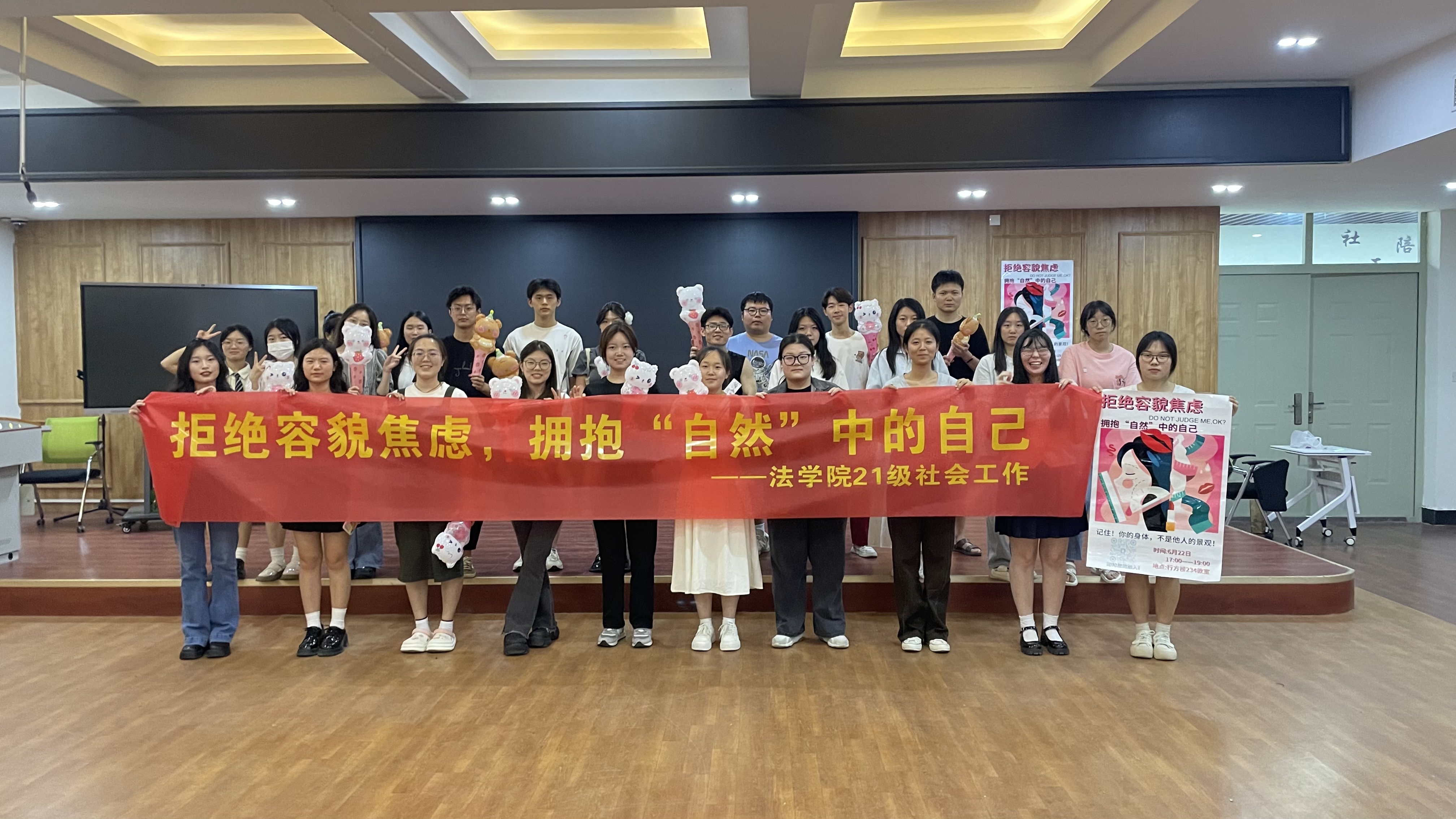 为了培养员工的性别观念,引导员工关注现实议题,提高社会工作实务能力,6月22日晚上,社工系21级员工在《女性社会工作》任课教师王晓莉的指导下,在行方楼234教室,举办了一场主题为“拒绝容貌焦虑,拥抱自然中的自己”的校内实践活动。活动旨在帮助校园中存在容貌焦虑的同学们接受真实的自我,拥抱自然的美好生活。
