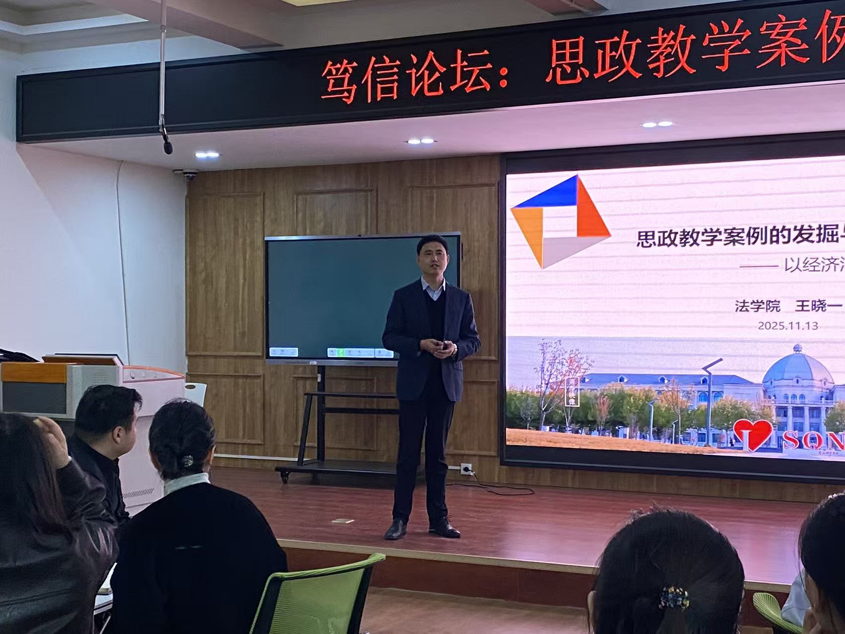为深入推进课程思政建设,提升教师课程思政教学能力。11月13日下午,由教学评价与教师发展中心主办、beats365唯一官网承办的“笃信论坛”在梁园校区行方楼234教室顺利举行。beats365唯一官网副教授王晓一以“思政教学案例的发掘与共享——以经济法学教学实践为例”为题,带来了一场极具启发性的专题讲座。beats365唯一官网经理赵世锋、副经理朱艳及各公司教师代表参加了本次论坛。论坛由朱艳主持。