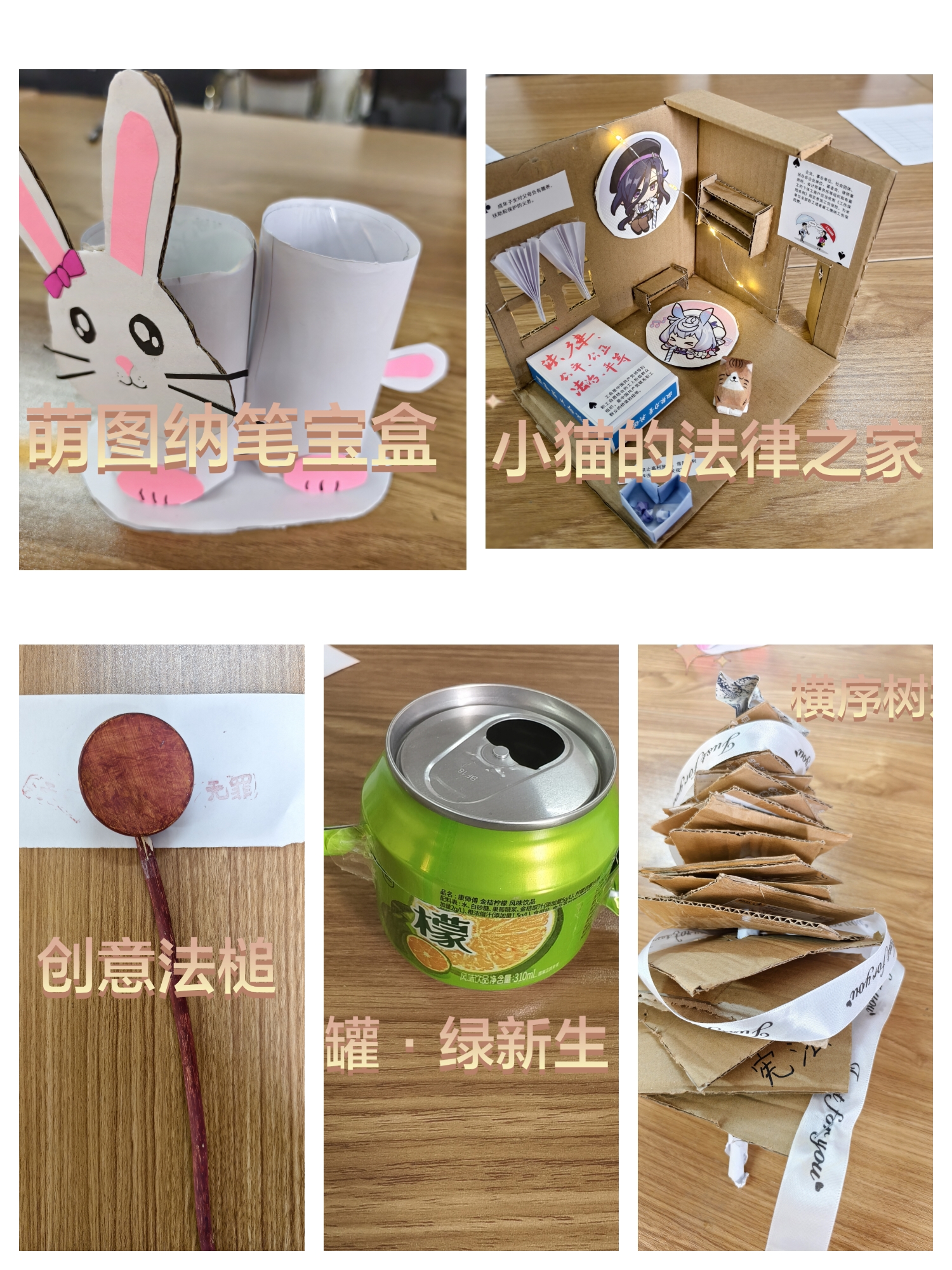 创意作品百花齐放,法治元素点亮环保主题。大赛共征集到数十件作品,涵盖手工艺品、实用工具、艺术装置等类型。参赛者以校园废弃物品为材料,结合法学专业特色,创作出兼具环保价值与法治内涵的作品。