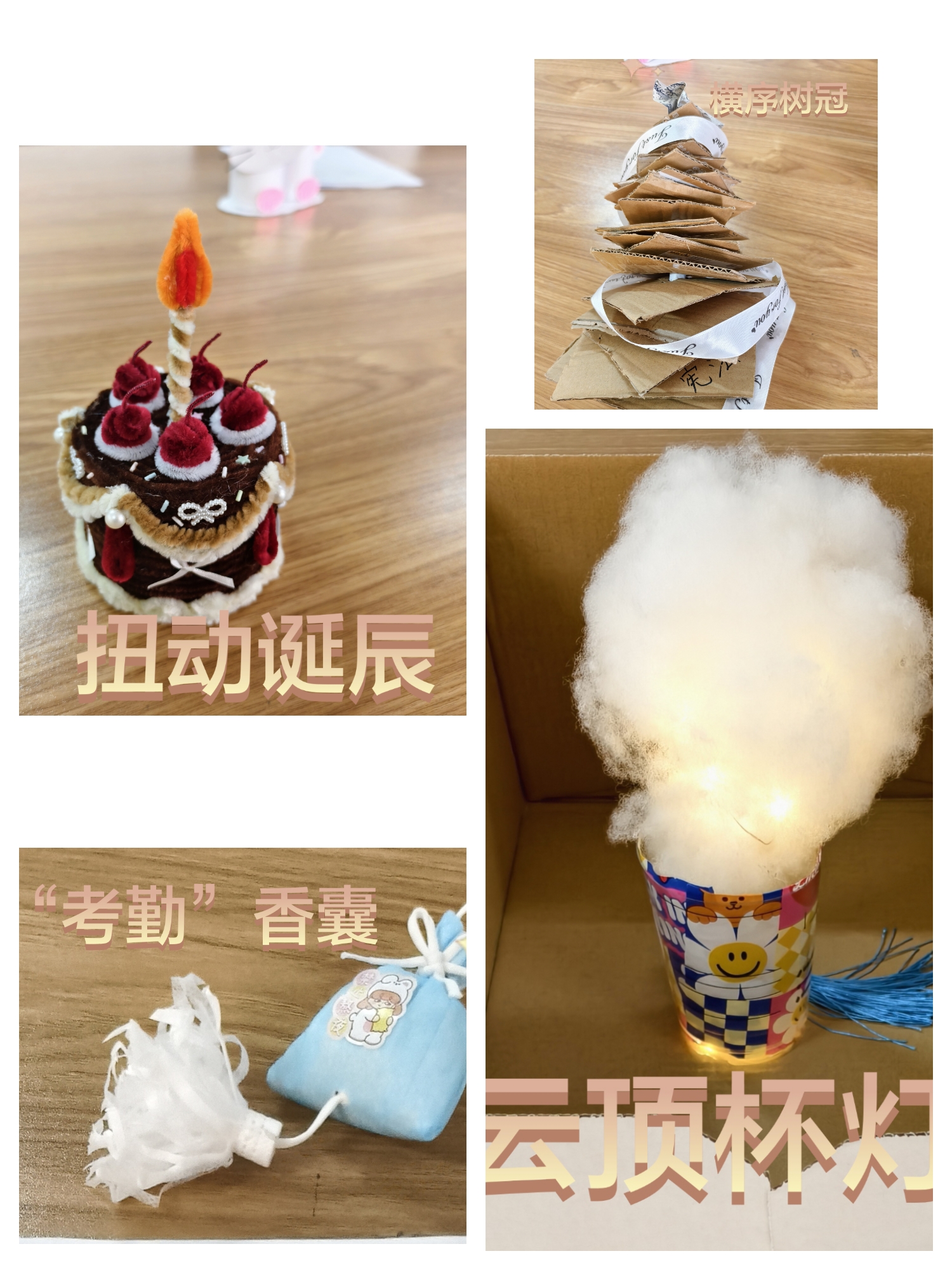 其他作品同样亮点纷呈:《罐意新生》将易拉罐改造成茶壶,传递慢生活与环保共生的态度;《“考勤”香囊》用过期口罩缝制香囊,赋予医疗废弃物新功能;《萌兔纳笔宝盒》以废饮料瓶制作萌兔笔筒,兼具实用性与童趣美学;《云顶夜灯》则用咖啡杯、旧棉花等打造氛围灯,展现废弃物的艺术潜力。