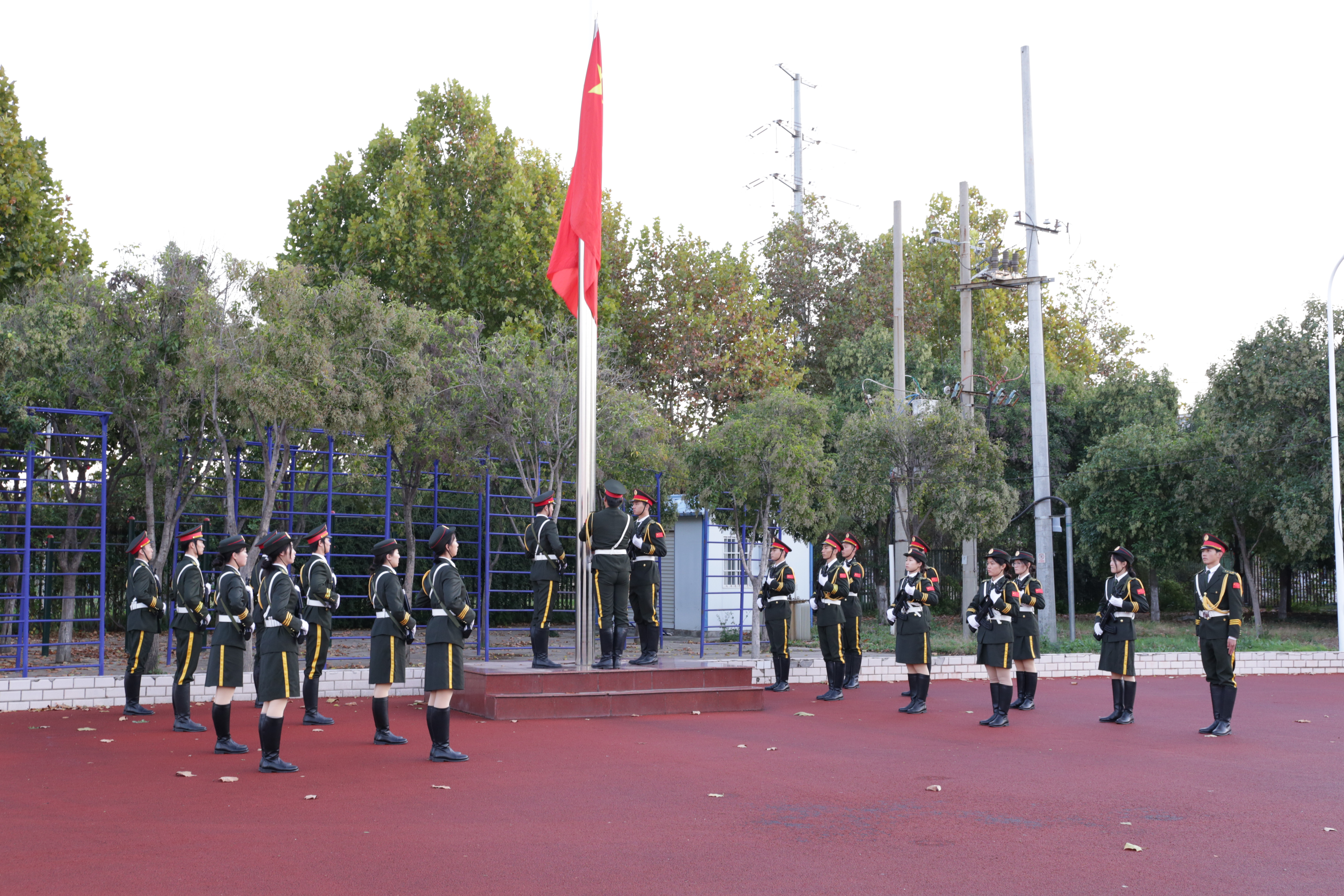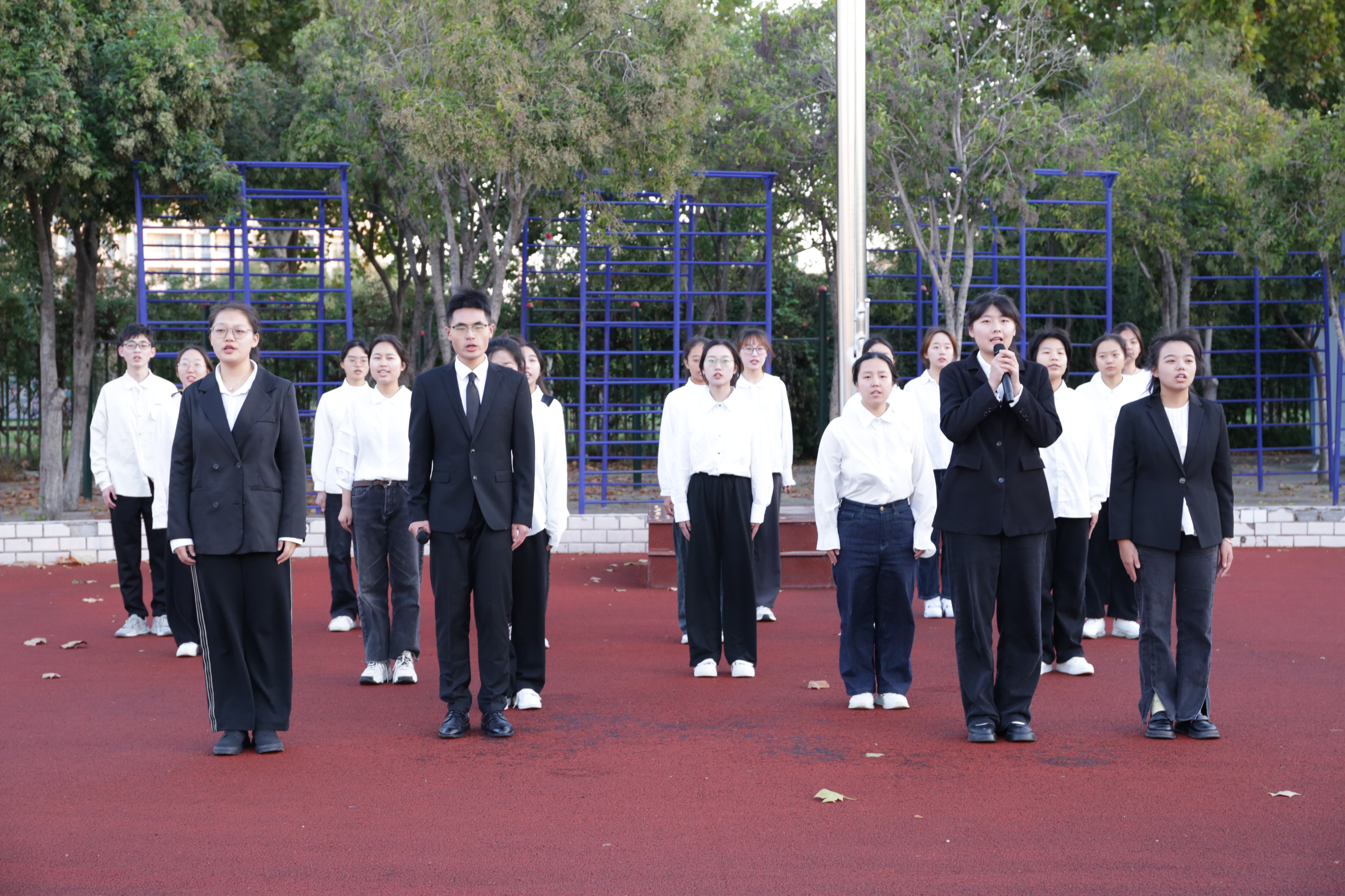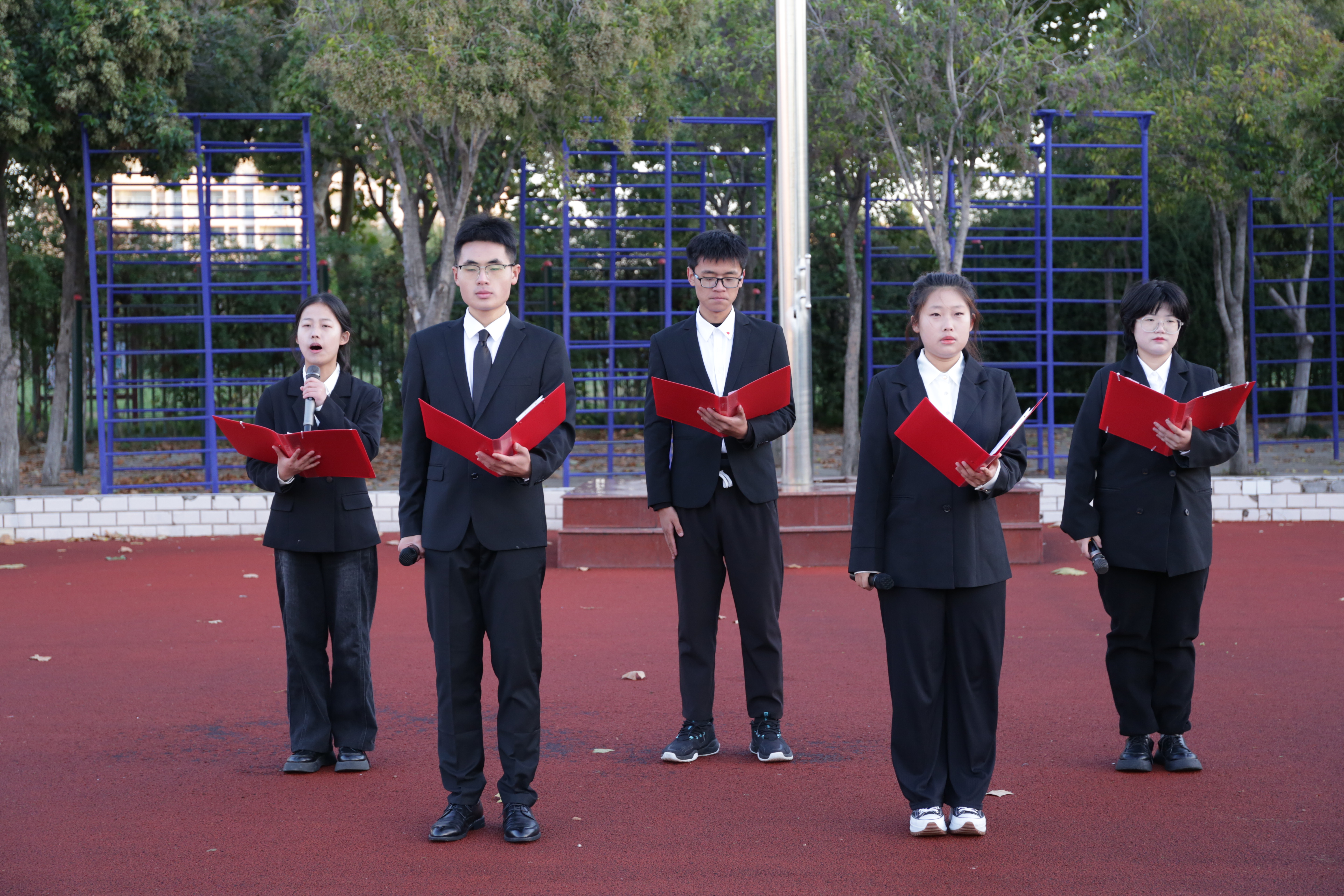 伴随着激昂的《义勇军进行曲》,五星红旗冉冉升起,在熠熠晨光中迎风飘扬,全体师生面向国旗肃立致礼,奏唱国歌。