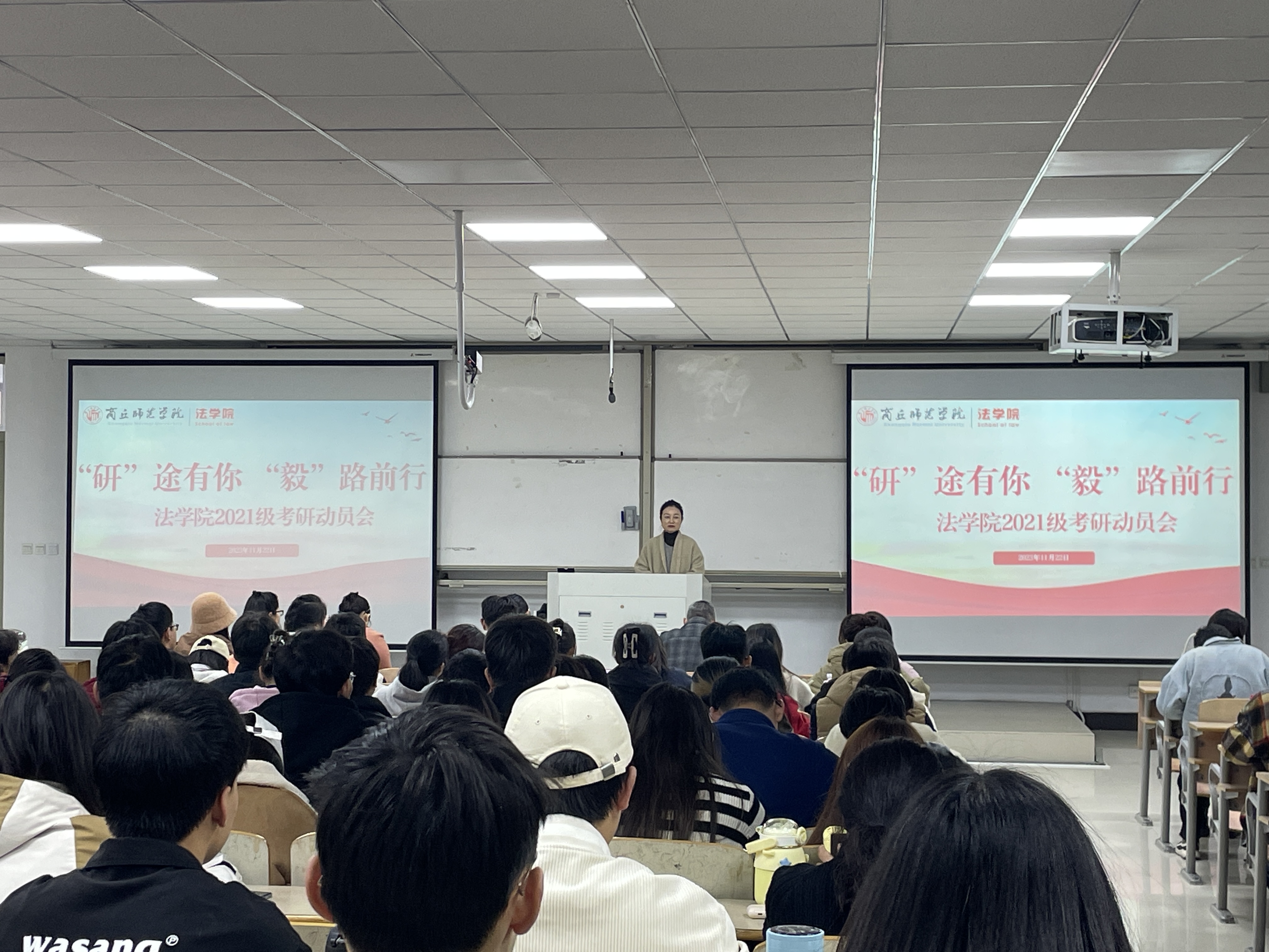 为激发公司员工考研热情,帮助员工了解考研形势、明确考研目标、做好考研规划,公司于11月22日下午在行方楼218教室举行2021级员工考研动员会。党委副书记郭静、副经理朱艳、法学系主任李祎、公共法律教研室主任王伟、社会工作系主任张静、2021级辅导员韩华及2021级全体员工参加了动员会。动员会由朱艳主持。