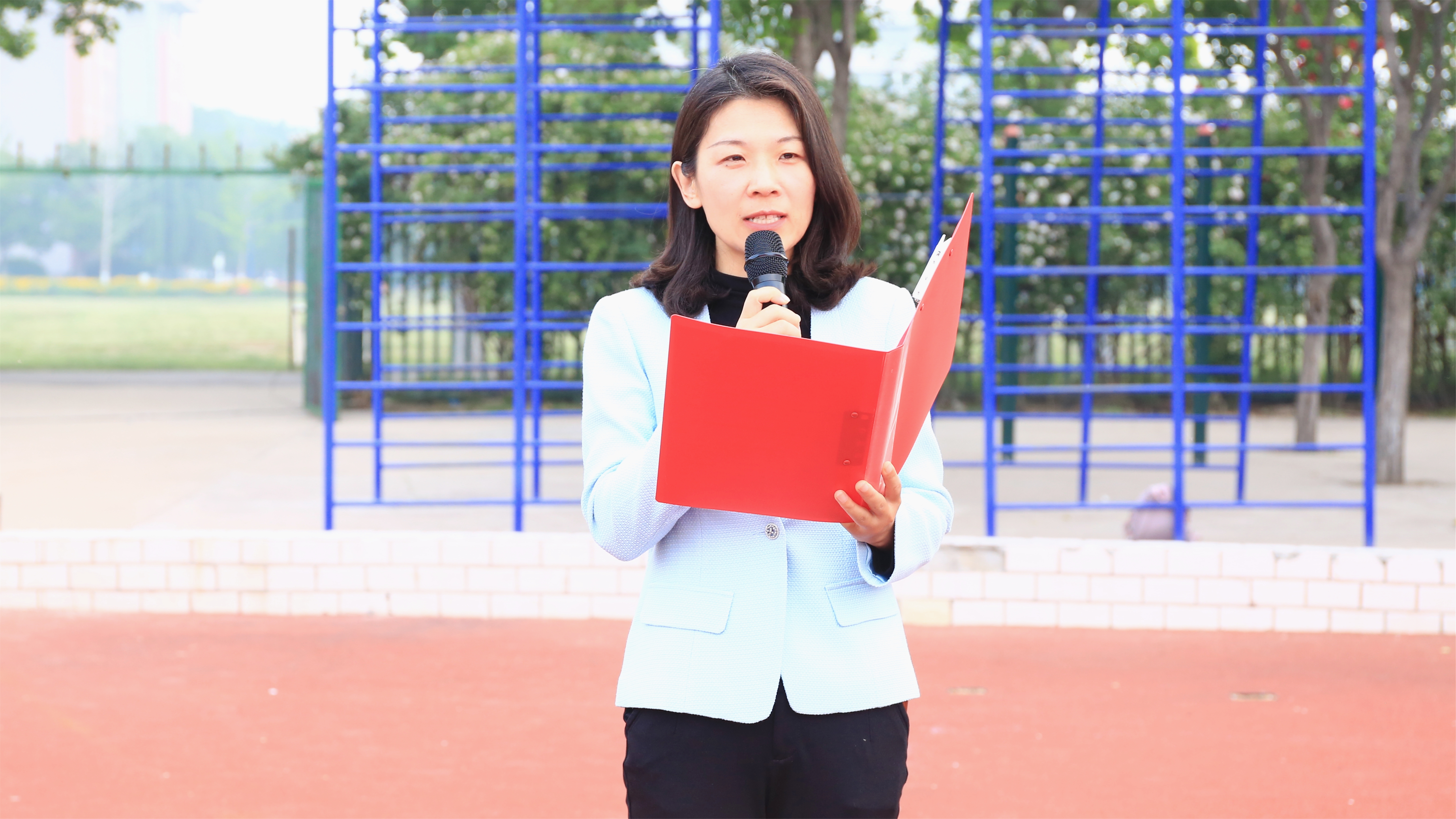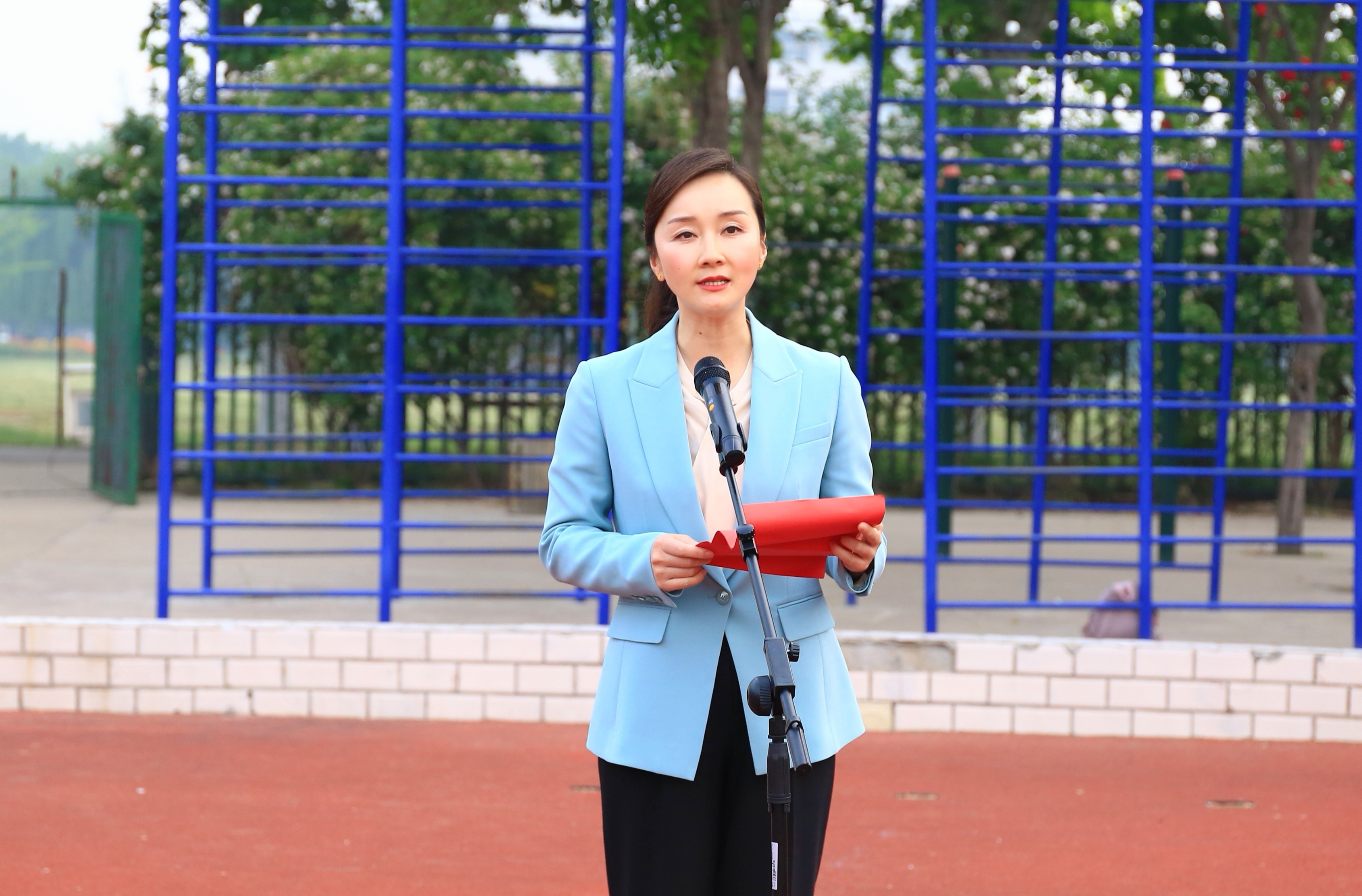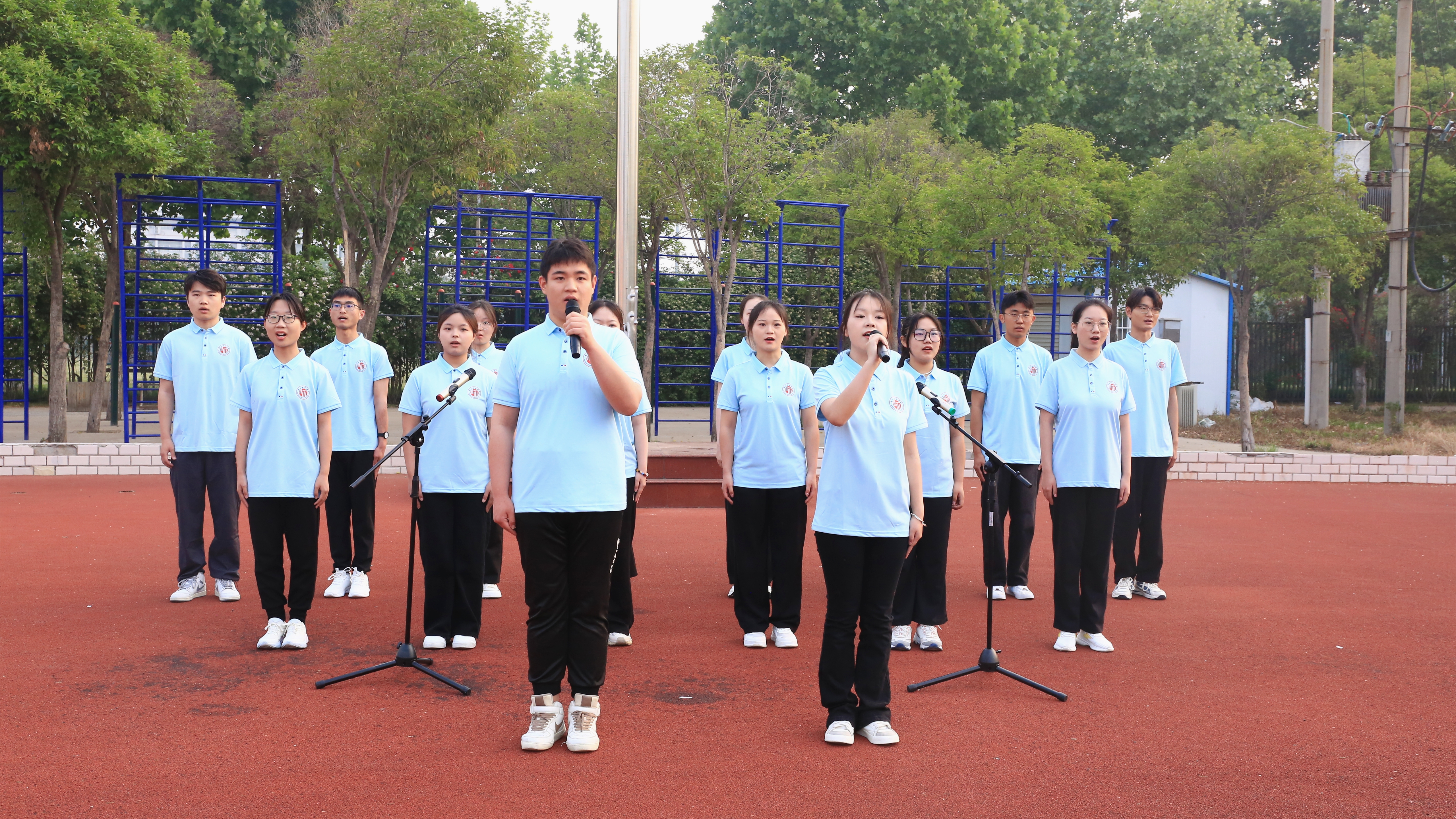 红日初升,国旗仪仗队步履铿锵。鲜艳的五星红旗在庄严的国歌声中冉冉升起,全体师生列队肃立、高唱国歌,向国旗行注目礼。